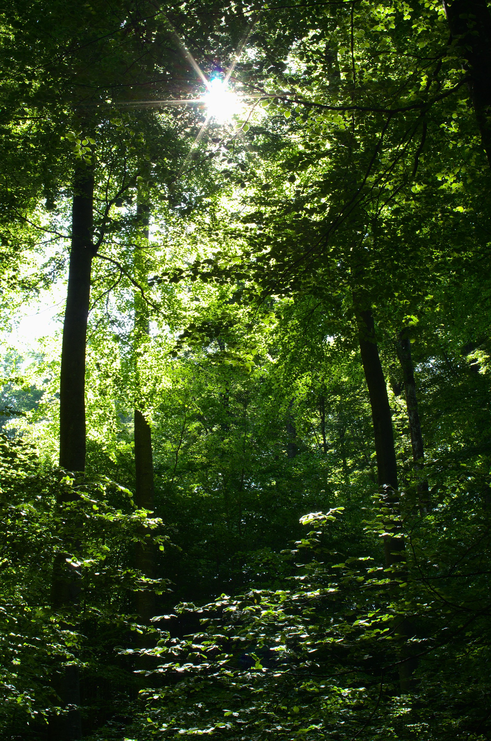 Die Sonne bricht durch das frische Laub der Bäume
